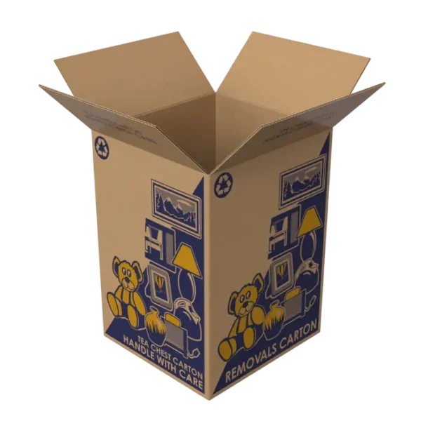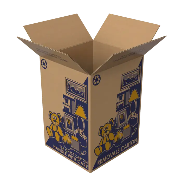 – Tea Chest Box comes pre-printed with generic print for labelling contents and “Handle With Care” label.